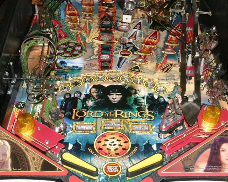 The Lord of the Rings pinball machine is a 2003 game designed by George Gomez and distributed by Stern Pinball. It is based on the The Lord of the Rings film trilogy, which was first released in 2001. It features the highest possible score multiplier in pinball to date: During a combined “Two Towers” and “Gollum” Multiball it is possible to achieve a 84x Jackpot (when scoring seven subsequent combo Jackpot shots, having the 2x scoring Elf gift and the Smeagol phase of Gollum Multiball running at once)!