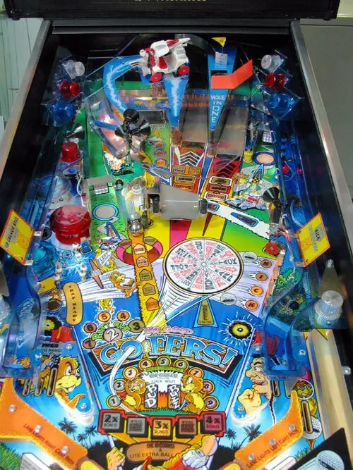 No Good Gofers pinball machine was Pat Lawlor’s final design for Williams before their eventual closing in 1999. The game revolves around Buzz and Bud, two gofers who are reeking havoc on any and all golfers playing on their “turf”. The gofers “pop-up” during gameplay to taunt the player, as well as provide entry ways to locks.