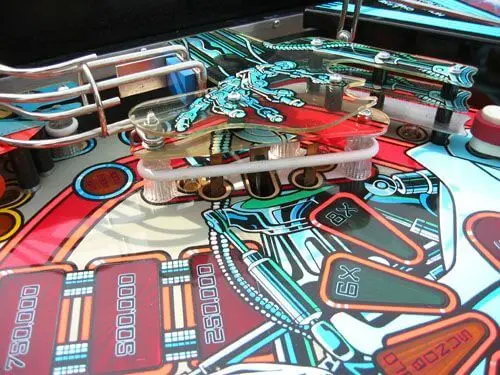 The table is the first Williams WPC machine designed to feature a dot-matrix display. But due to the long design phase, Gilligan’s Island was the first manufactured with a DMD. Terminator 2: Judgment Day was the first game to feature an autoplunger (replacing the traditional plunger), as well as a ball-firing cannon. Finally, T2 was the first game to feature a video mode, a mini video game featured on the DMD. Arnold Schwarzenegger provided voices for the game. The playfield design was based on Ritchie’s 1980 classic, Firepower. T-1000 was not included in the artwork of the table, with the exception of a small image of actor Robert Patrick because of pre-release secrecy of the movie. The character was only included in the display animation because when the DMD programming was finalizing the liquid metal character was already public knowledge.