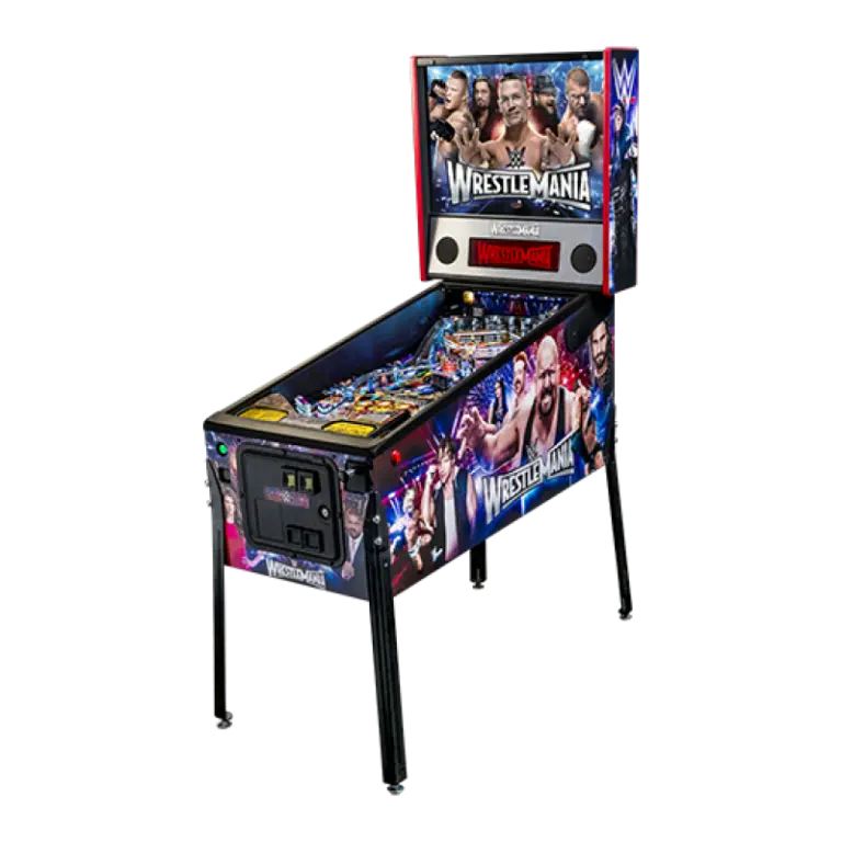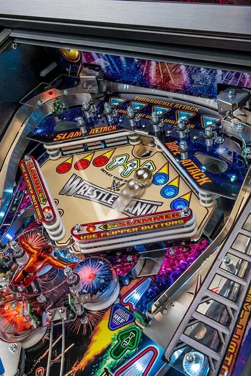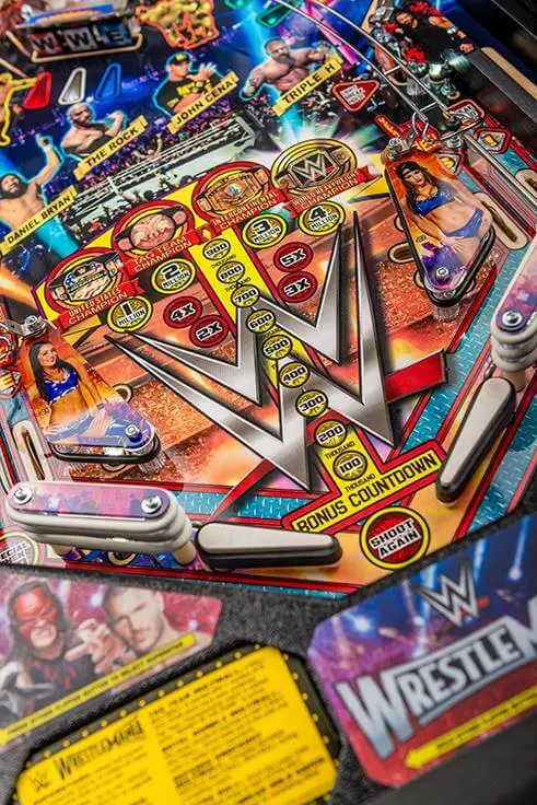 The WWE Pro and the Limited Edition machines feature an innovative upper pinball playfield wrestling ring. With the flipper buttons, players control two Slammer slingshot-style kickers in the ropes of the ring. Completing the three drop target bank starts a wrestling match. Players rack up points and pin opponents in the ring by shooting into a kick out hole. Keeping the ball in the ring and hitting as many targets as possible will advance players through the match. Multiple ramps guide the ball throughout gameplay, while brilliant lightshows highlight the all LED playfield. Ten licensed songs include intro music for wrestlers that players choose. WWE announcers Jerry The King Lawlor and Michael Cole add play by play excitement.